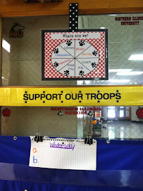 Last year I used this shelf for something else and it became messy and cluttered so I decided to use it more wisely this year. This shelf will hold student work supply baskets and pencil boxes. In the baskets I have community supplies such as bottled glue and markers. Then in the open space on the shelf, students will put their pencil boxes away when they are not in use. This will help keep the tables from being so cluttered (especially with class sizes constantly growing). Next to the shelf is the 3-drawer storage unit. This storage unit is actually my "Creative Center". The top drawer holds all different types of scissors and tape for students to make their masterpieces. The next drawer holds different types and colors of paper and the 3rd drawer holds all different kinds of stickers. Student's take what they need from the drawers, go back to their seats and start getting CREATIVE! They are located next to the supply shelf so that students can easily access their glue and markers as well!